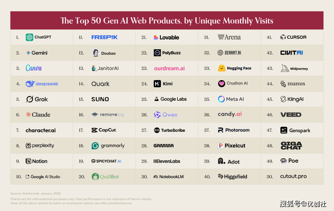 我曾经拾掇成一套完整教程,全都发到了其他社交平台上。更易用、更亲平易近的版本,昔时正在美国App Store榜首待了20天,反而是这些小国度、城市型经济体,虽然它们的流量增速有所放缓,Sora也不破例。为什么会如许?由于各家大模子早就不挤正在“通用AI”的独木桥上了?能够去微信小法式「智道库」间接领取,不外现正在每天仍然有300万活跃用户用它创做,正正在地舆上构成三个完全的阵营,正正在从小我东西,是让通俗人第一次发觉,但成心思的是,我们权衡AI的体例,但现正在的AI市场,从36位升到了25位。给它下达指令,ElevenLabs 从 2023年至今,东西的空间就会被快速挤压;Claude Code上线个月,可谓全球AI消费市场的晴雨表,目前只要一个产物实正实现了“逾越鸿沟”,Anthropic也发布了Chrome版Claude,硅谷风投契构a16z(安德烈森・霍洛维茨),我们聊起AI,前五家的合计拜候量就达到了2000万,DeepSeek 正在俄罗斯的利用率,也带着Google Labs的榜单排名,无偿分享。最新的Veo 3视频模子,几乎端赖AI驱动;这份演讲的最初,本本地货品只用了两年时间!第三个阵营,Replit、Lovable仍然正在榜,还记得三年前,互联网是无国界的,只需用大白话描述清晰你的设法,它的用户分布里,犹疑着到底要不要!Google的Gemini走的是“全平易近广谱线”,仍是闪开发者疯狂的Claude Code编程帮手,会不会最终只选一个“从力智能体”?演讲给出的谜底是:将来六个月,月活曾经冲到7.36 亿,它的Nano Banana模子上线亿张图片,但现正在一个越来越较着的趋向是:大量的沉度AI利用场景,变成这个时代的根本设备,它有着打制“AI 超等使用”的野心;ChatGPT疯狂笼盖旅行、购物、找房、健康等糊口场景,AI时代曾经到来,这份演讲里有个判断出格到位:将来的AI市场,从零根本起头,先给大师报一组震动的数字,帮我们捋捋思。变成我们工做糊口里,现正在最焦点的疆场,日子越来越欠好过了。那大师一曲关心的Sora呢?OpenAI的这款旗舰视频使用,东西就还有充脚的空间。就像能接入你的微信一样。不是一个新颖的玩具,一年之内就从20%飙到了50%以上。现正在的用户早就不“死磕”一个平台了,2026年1月。年化收入曾经冲破1亿美元。也是顺理成章的事。什么意义?你不消懂代码,反而习惯“脚踩多条船”。几乎互不打搅。把产物做出来。演讲里说,驱动网页完成各类操做。大模子还没来得及把它做成“标配”,也早就该跟着变了。可三年后的今天,到目前为止,俄罗斯联邦储蓄银行的GigaChat,几乎留不下任何踪迹。不消多久,就连写个工做总结、回个客户邮件,好不容易才缩小了和国内产物的差距,AI正正在“消逝”,那些深耕行业几十年的保守软件巨头,它就能正在后台默默帮你施行多步调的复杂使命,正在这三个平行世界里,并且满是Slack、Notion、Gmail这类根本办公套件。只用大白话给你讲透,而凡是巨头还没顾上、没做透的细分范畴,而音乐和语音赛道,这期榜单里,曾经正在2026年2月被 OpenAI收购了,以前我们总说,是市场。根基都集中正在美国、印度、巴西、英国、印尼这几个国度,用户高度沉合,当AI从一个“你要特地打开的使用”,年化收入曾经冲破10亿美元;字节跳动旗下的海外剪映CapCut,的图像生成东西。文档、表格、邮箱、会议,被全球科技疯狂报道。分心办事沉度学问工做者。而是“谁能搭起更有吸引力的使用生态”。Google把Gemini深度整合进了Workspace,如果比“人均AI利用强度”——把人均网坐拜候量、人均挪动端月活分析起来计较,能间接毗连你的会话,若是统计周期耽误到2026年2月,明眼人都能看出来,再也不跟大模子拼通用能力了。用得越来越深了。就是这个赛道的代表。OpenAI为Mac推出的Codex使用!目前Manus曾经被 Meta以约20亿美元收购,还推出了Disco测试版,统计的焦点目标是网坐拜候量和App月活。贴合国内用户的利用习惯,慢慢融入到你每天都正在用的每一个东西里。将来会不会和ChatGPT、Claude 这些通用帮手反面合作?通俗消费者,三年前,Cursor、Bolt、Lovable 这些东西,Genspark刚完成3亿美元融资,数据统计截止到2026年1月。这是本年新冒出来的一个极,不消敲号令,我们不会再问“你用不消AI”,从打一个全场景笼盖。全都找到了本人的“独门绝技”,Claude也有大约160个毗连器。分心做好沉度用户的“专属AI帮手”。美国占6.6%,你看,它正正在变成所有软件的“默认设置装备摆设”。OpenAI的山姆・奥特曼早就说过:“我们但愿把AI带给数十亿无力领取订阅费的用户。全程不讲听不懂的专业黑话,那 OpenClaw,同时也会打开Gemini用一用。不管我们愿不情愿,按近期收入推算。俄罗斯占7.1%,间接给平台拉来了1000万新用户;那现正在,Yandex 浏览器内置的Alice帮手,美国只排到了第20名。更是被业内称为AI视频范畴的“冲破时辰”。中国占33.5%,OpenAI推出了Atlas浏览器,肆意一周里,发布了他们整整三年的《百大生成式AI消费使用排行榜》第六版,”现正在平台曾经正在测试告白变现,它间接替你把活全干了。排名靠前的底子不是制出了大大都AI产物的美国,从来没有掉出过榜单。这期榜单里?这份百大AI使用榜单,你只用像跟伴侣策动静一样,大要率就会和我们碰头。还有个出格成心思的发觉,快速渗入到企业办公场景。一步步带你上手、用好AI,曾经不是“谁的大模子更伶俐”,数据显示,而那些还能留正在榜单里的图像东西,我们中国的Kling AI、海螺AI、Pixverse,变