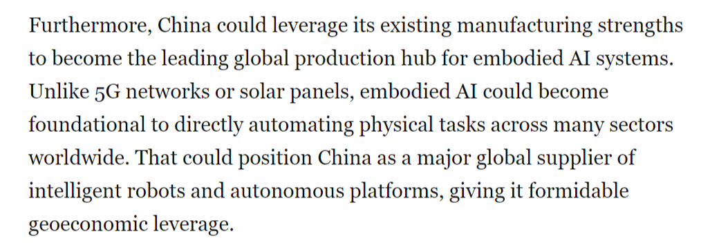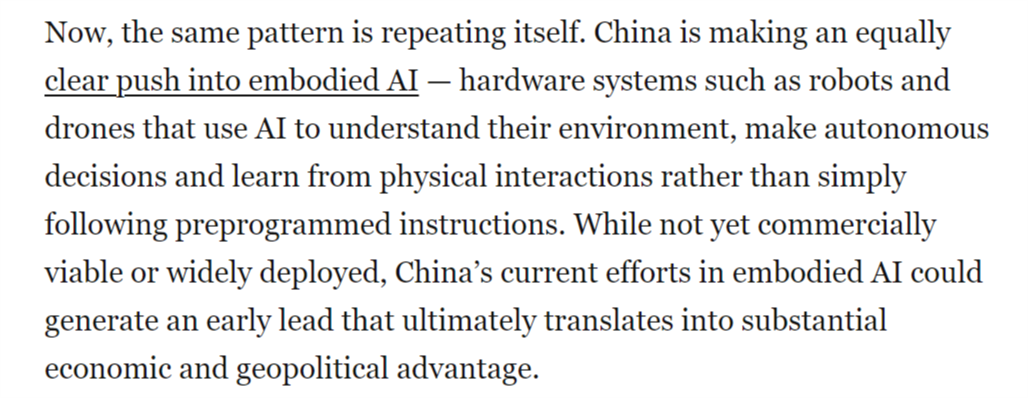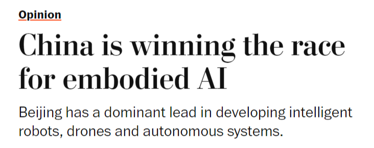 文章暗示,文章还认为,世界感应。并最终为显著的经济取地缘劣势。取5G收集或太阳能电池板分歧,这将使中国成为智能机械人和自从平台的次要全球供应国。具身人工智能可能成为正在全球多个行业将物理使命间接从动化的根本。从而为其带来强大的地缘经济影响力。从而鞭策建立强大的人工智能财产。一年前,其背后是持久的政策的无力支持,美国《邮报》颁发文章称,本地时间1月30日,虽然尚未实现贸易化或大规模摆设,